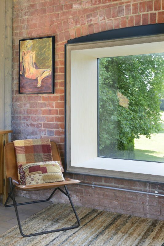 At The Gardener’s Cottage, crafted red brick, laid with patience and precision, catches the morning light and frames views of the surrounding woodland. Here, light becomes a material in itself; it journeys through clerestory windows, bouncing softly across brick and oak.